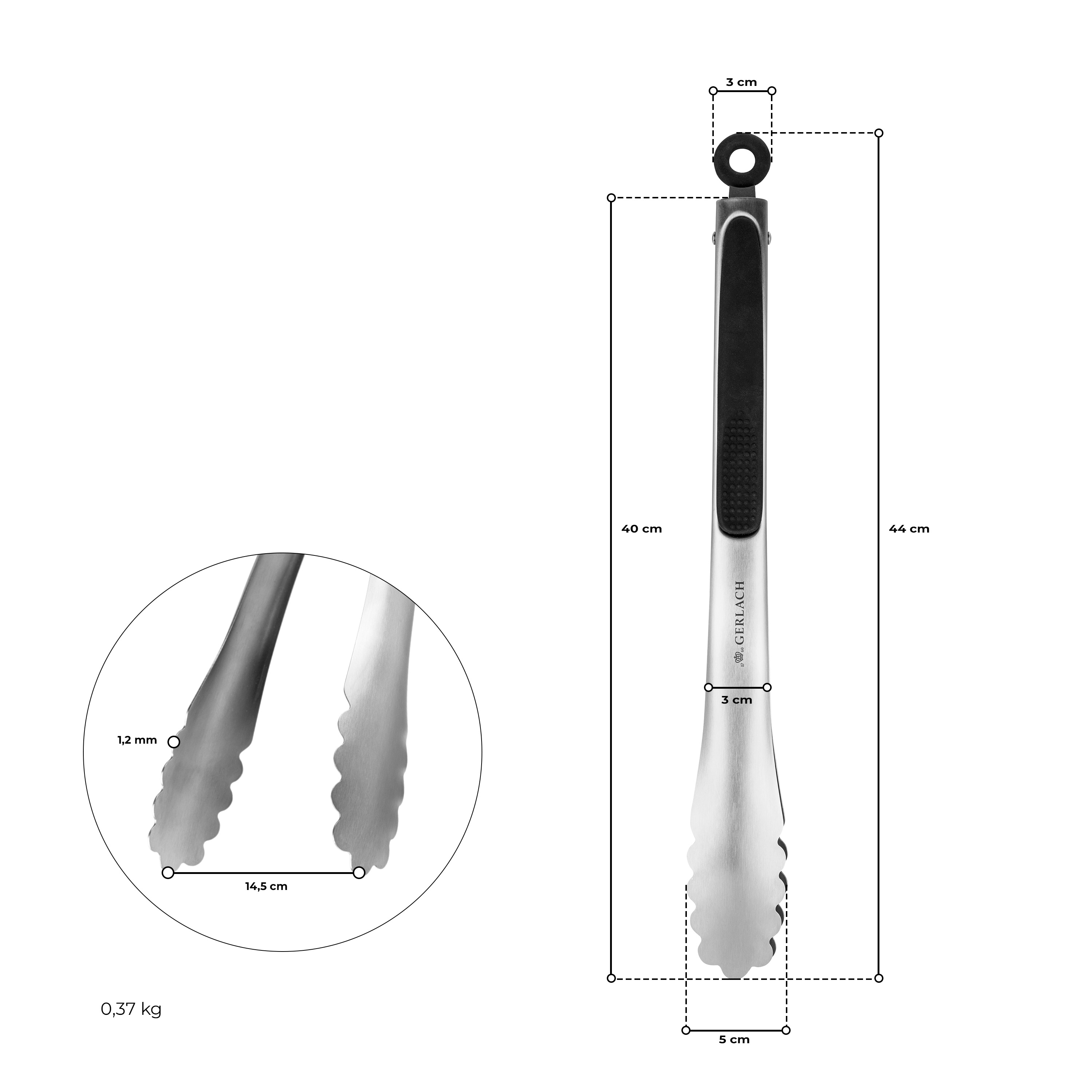 Szczypce zostały stworzone z myślą o użytkowaniu ich w trakcie grillowania na różnego rodzaju urządzeniach, np. elektrycznych czy gazowych. Długość 40 cm pozwala na utrzymanie odpowiedniej odległości od smażonych składników, co zwiększa bezpieczeństwo w trakcie pracy. Nie należy ich jednak stosować na patelniach z powłokami nieprzywierającymi, ponieważ stalowe końcówki mogą porysować ich powierzchnię.